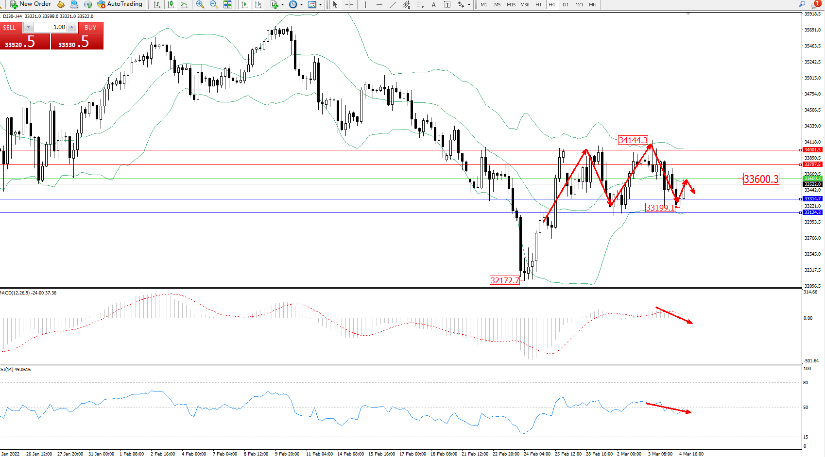 道琼斯指数DJ30——4小时K线图显示: