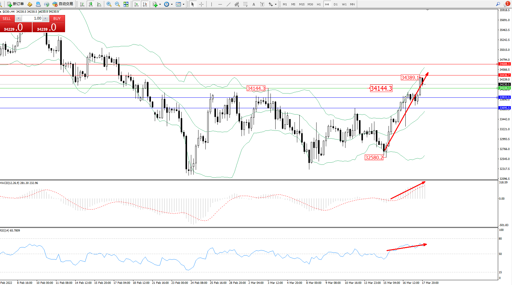 技术点评:多头动力延续布林带指标中上轨区间持续震荡上扬,高位抵达34389位置节点有震荡,短期多头动力有继续攀升态势,布林带指标呈张口走势后开始于有收口迹象,MACD指标处于多头区域维持整理上移,RSI指标处于多头区域维持窄幅徘徊中;
