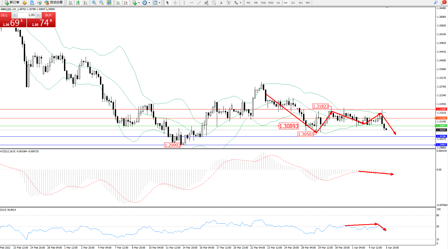 技术点评:空头动力维持在布林带指标通道内窄幅整理持续下行,前期低位1.30503位置节点近在咫尺破位在即,布林带指标呈收口走势后开始缓慢张口向下移动,MACD指标处于0轴线下侧弱势徘徊中,RSI指标处于50均衡线附近弱势整理后开始不断下行;