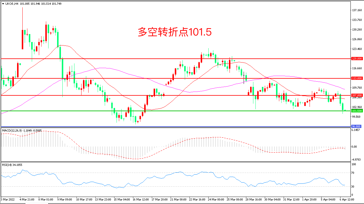 周三(4月6日),在美国宣布大举抛售战略原油储备后,周三据华尔街日报报道,国际能源署(IEA)的成员国们,正计划从他们的储备中再释放近6000万桶石油,布伦特原油大幅回落,收报101.74美元/桶。此外,昨晚公布的EIA数据也对油价构成抑制,数据显示,美国原油产量连续第二周上升,回到2020年5月以来的最高水平,多重利空因素的袭击下,油价面临巨大压力。