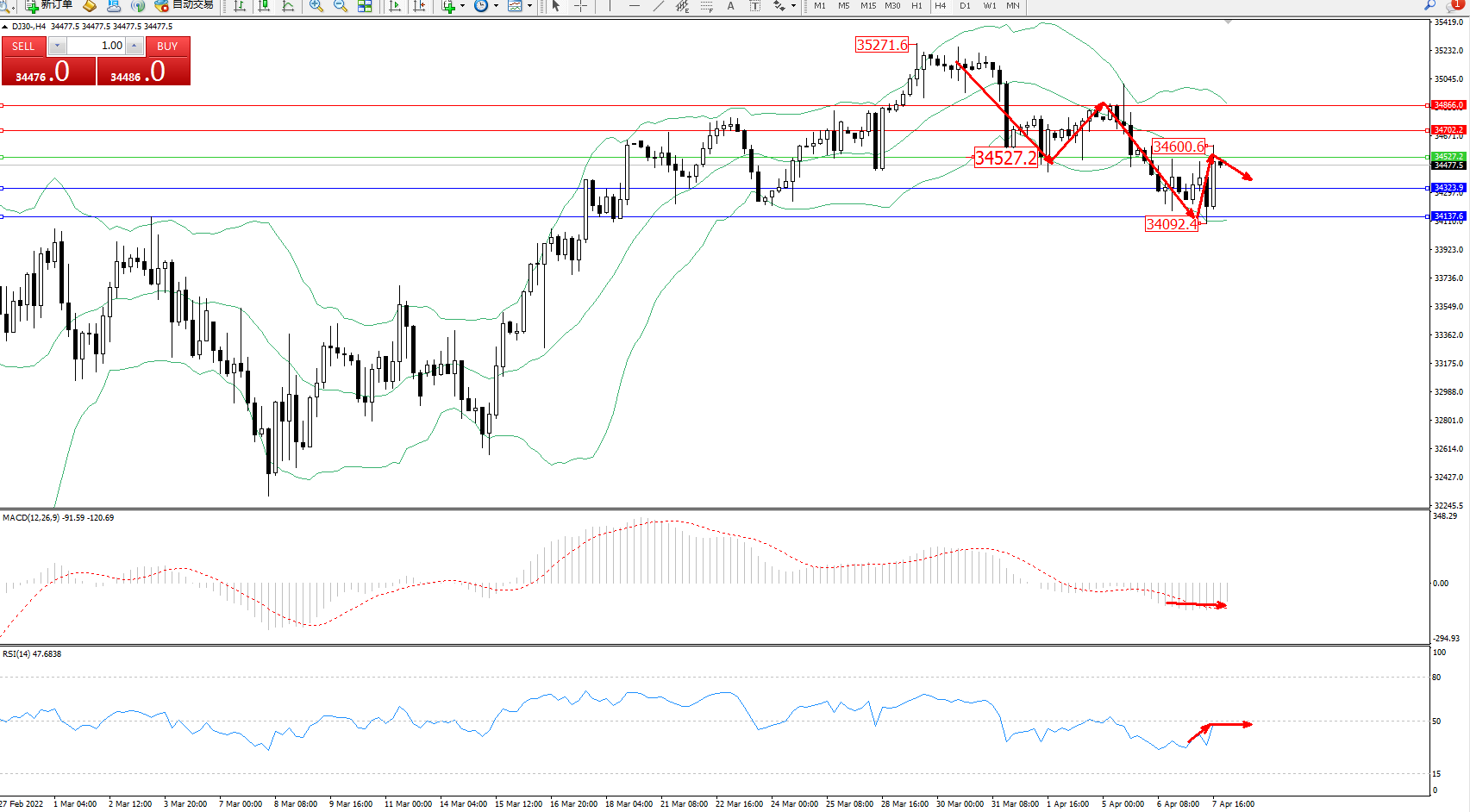 交易策略:34527下方看跌,目标34323、34137