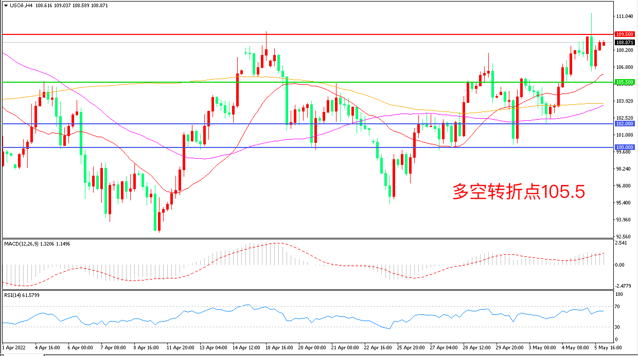 周四(5月5日),以沙特和俄罗斯为首的产油国联盟OPEC+坚持小幅增产的原定计划,仅增产43.2万桶/日,美国WTI原油延续强势表现,收报108.88美元/桶。有数据显示,OPEC在4月仅增产了1万桶/日,表明该组织在按计划提高产量方面确实存在困难,欧盟计划对俄罗斯石油实施禁令仍在讨论中,重点关注后续进展。