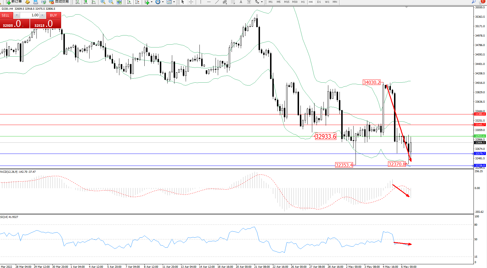 道琼斯指数DJ30——4小时K线图显示: