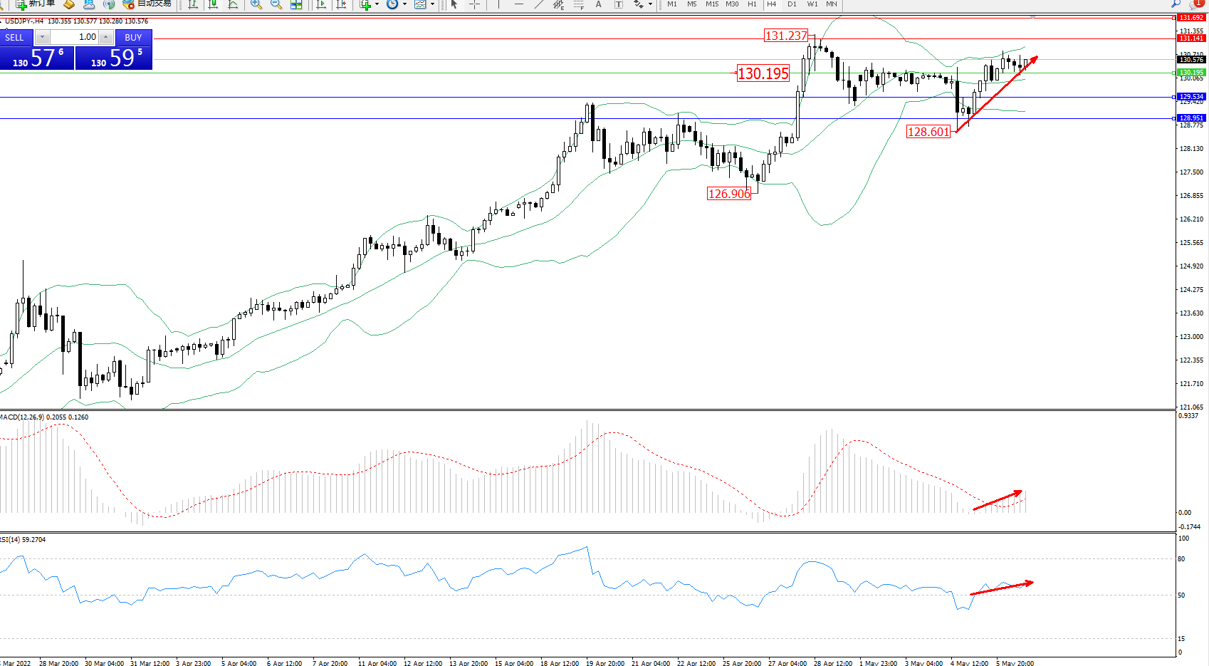 交易策略:130.195上方看涨,目标131.141、131.692