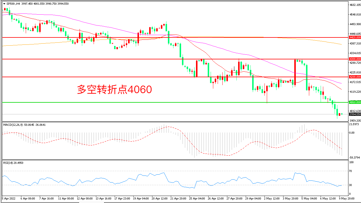 周一(5月9日),因继续担忧央行收紧政策、高通胀和全球经济成长放缓,市场出现“恐慌性”抛售,标普500破位大跌,收报4000.75点。近期,出于对通胀和随之而来的高利率的担忧,投资者大量逃离风险资产,本周还有多位地区联储主席密集讲话,结合重磅通胀数据发布,美股延续宽幅震荡概率较大。