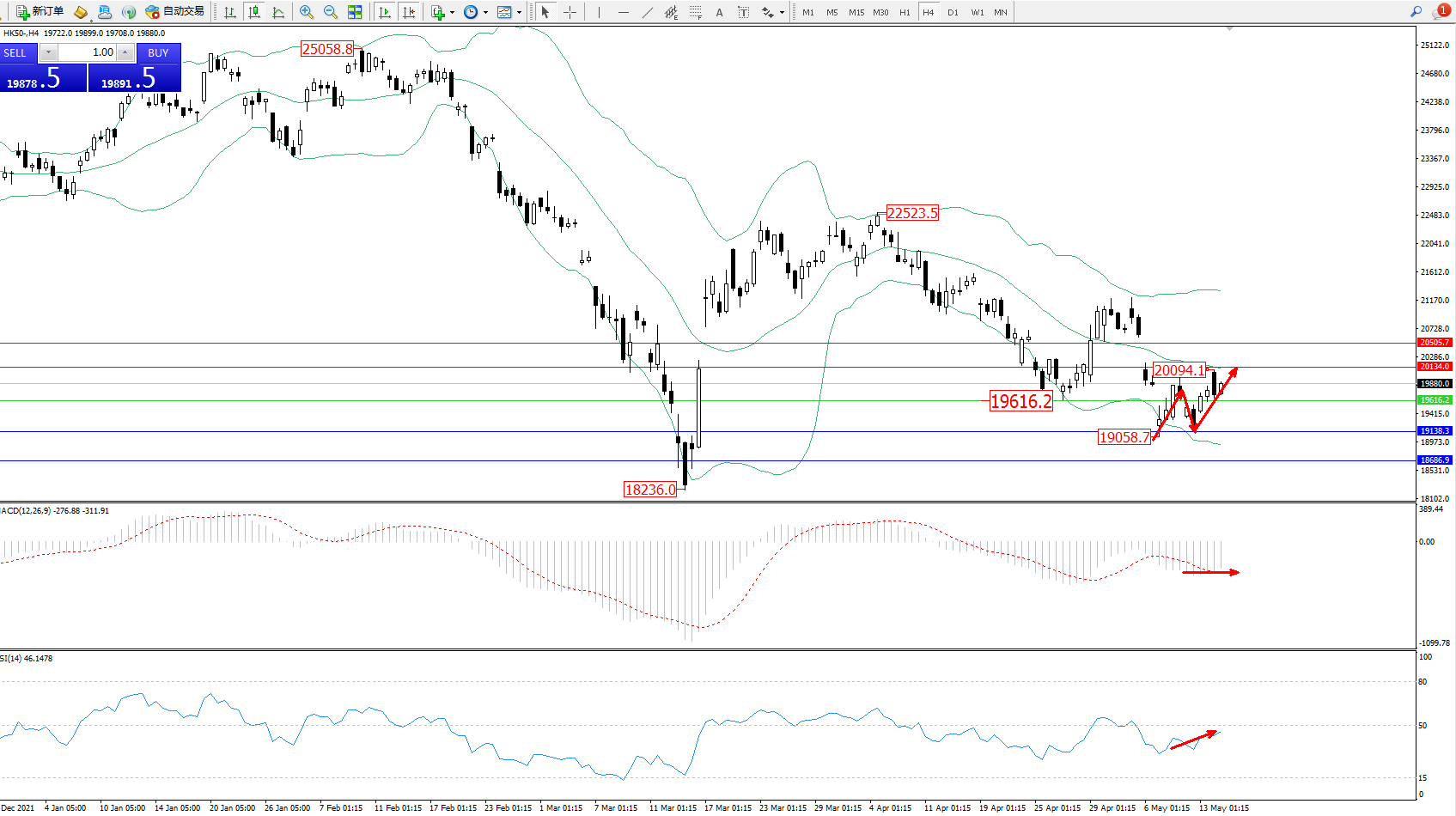 恒指HK50 ——4小时K线图显示: