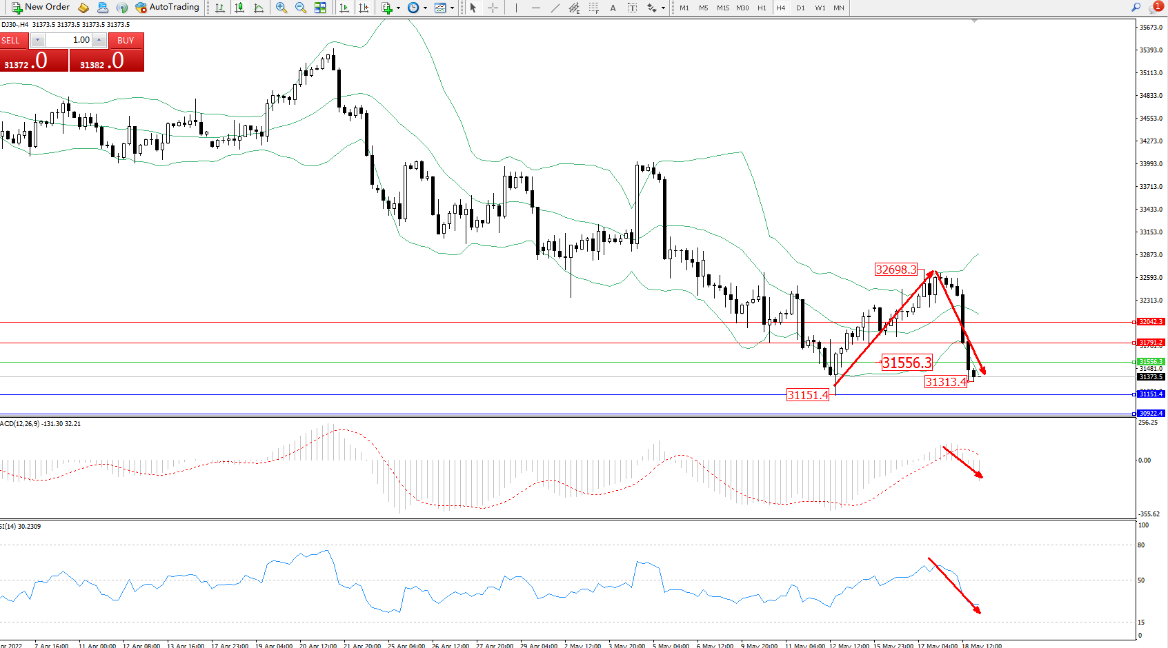道琼斯指数DJ30——4小时K线图显示: