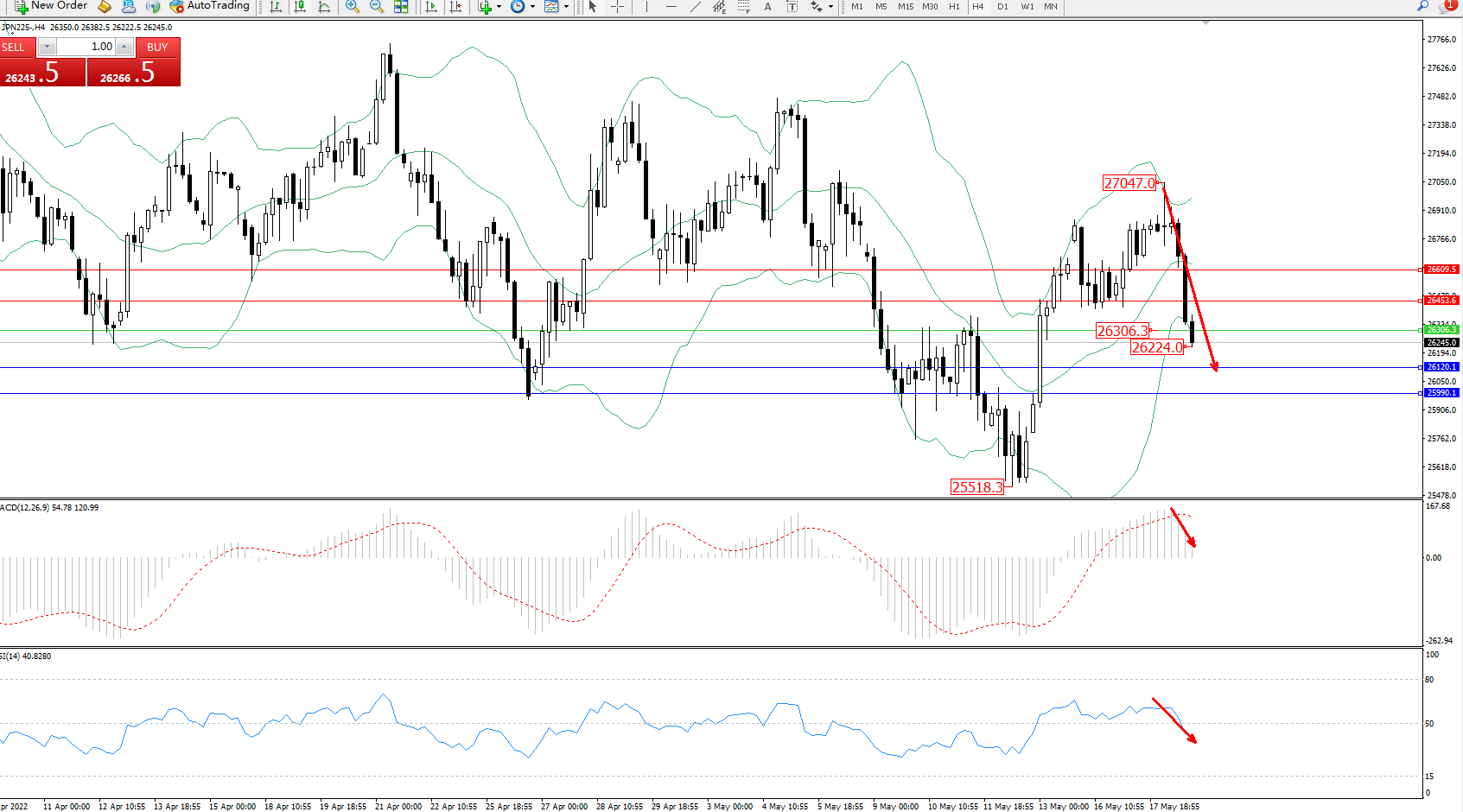 日经指数JPN225——4小时K线图显示:
