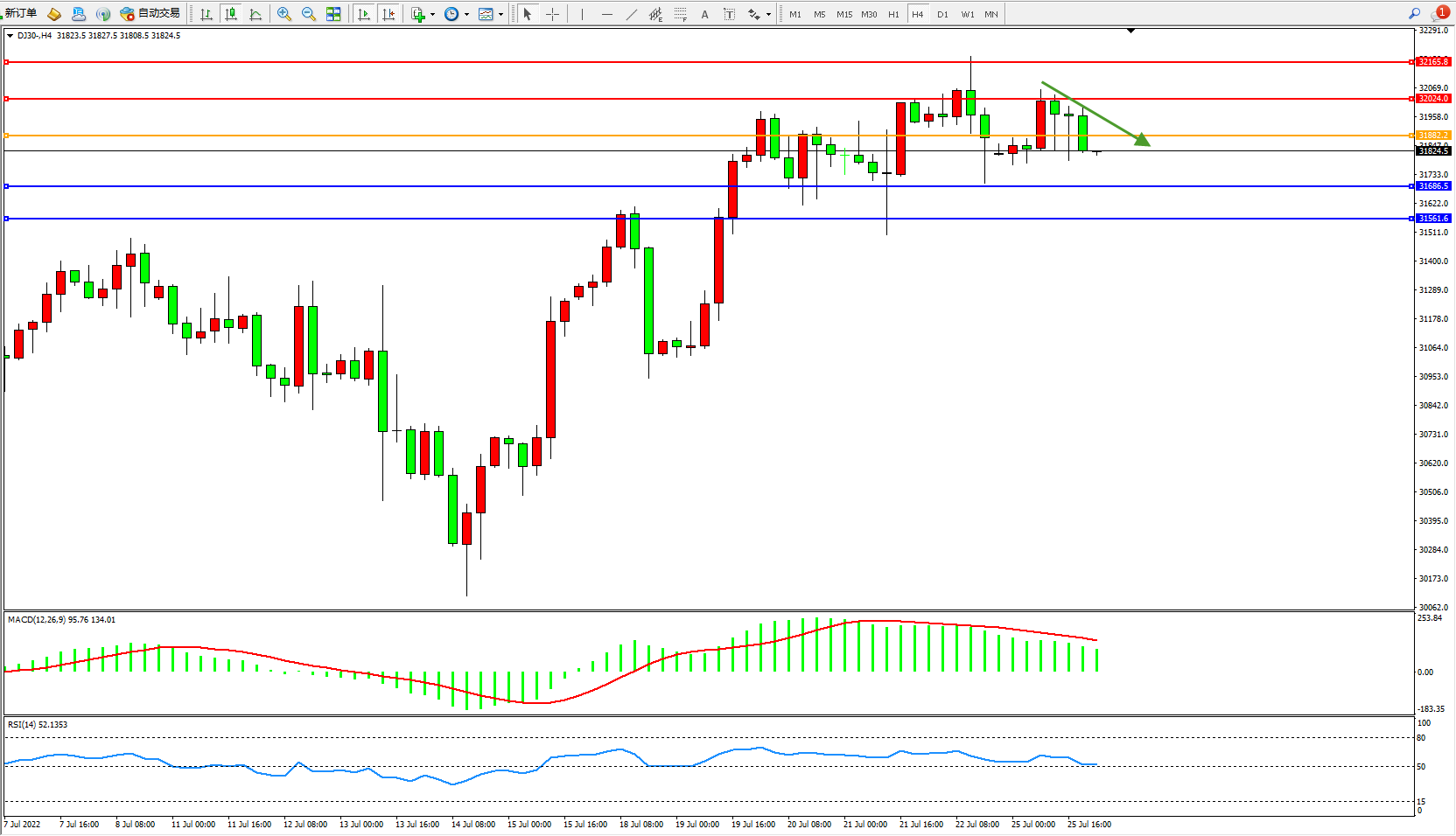 道琼斯指数DJ30——4小时K线图显示: