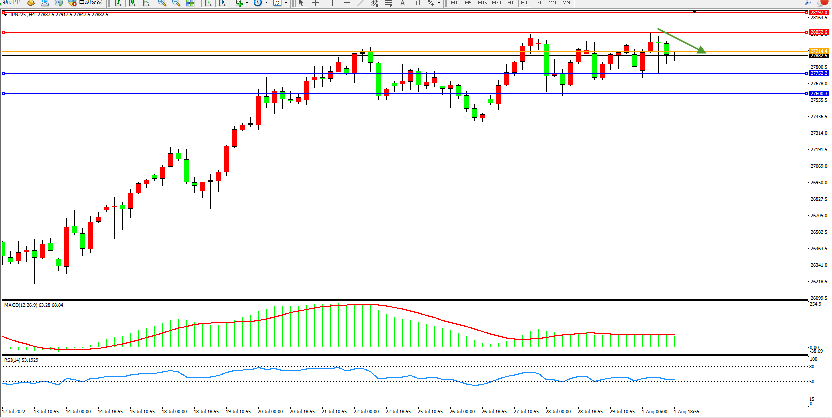 日经指数JPN225——4小时K线图显示: