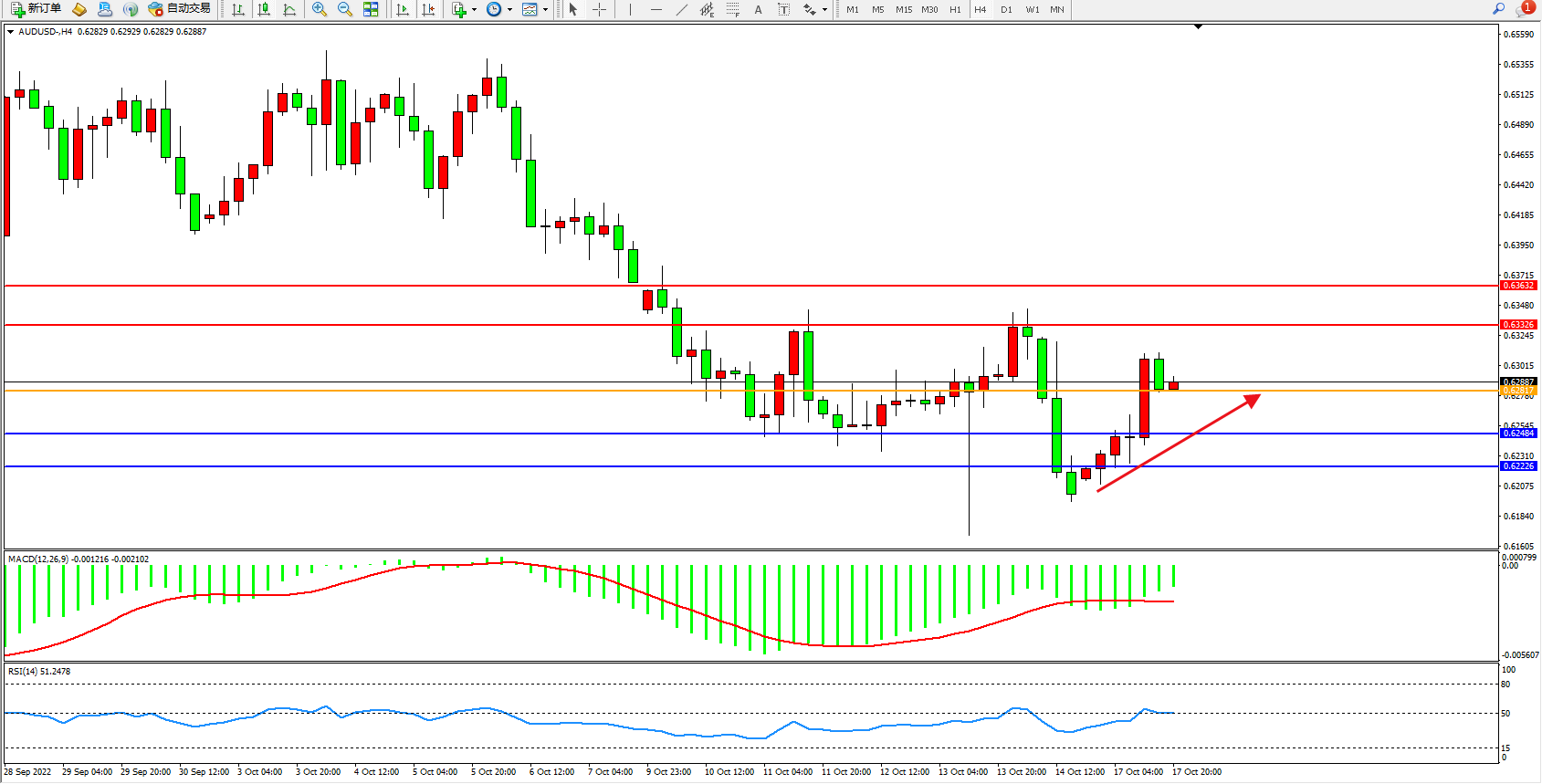 交易策略:0.62817上方看涨,目标0.63326、0.63632