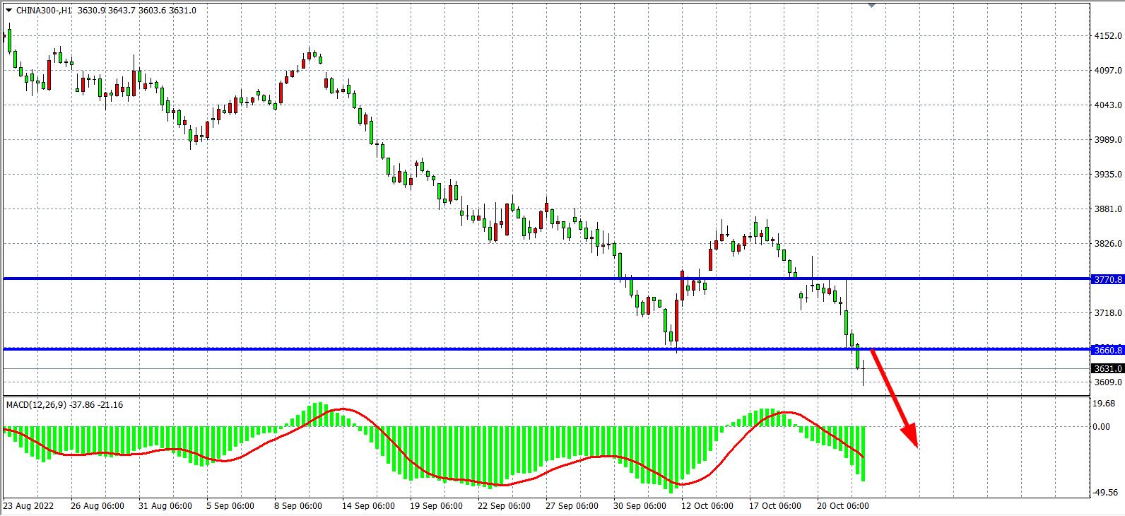 1小时图看,沪深300再度反弹压力3770附近出现受阻大跌破位前低点3660附近,MACD于零轴之下开始重新急剧放量,短期趋势显示空头开始加速,日内在3660之下继续看跌,下方看3600-3500。