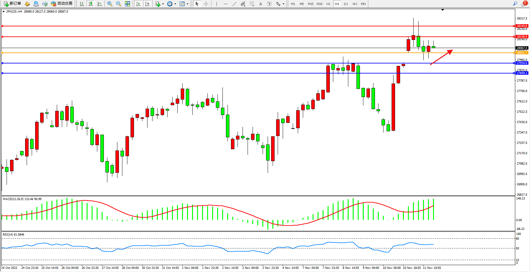 日经指数JPN225——4小时K线图显示:
