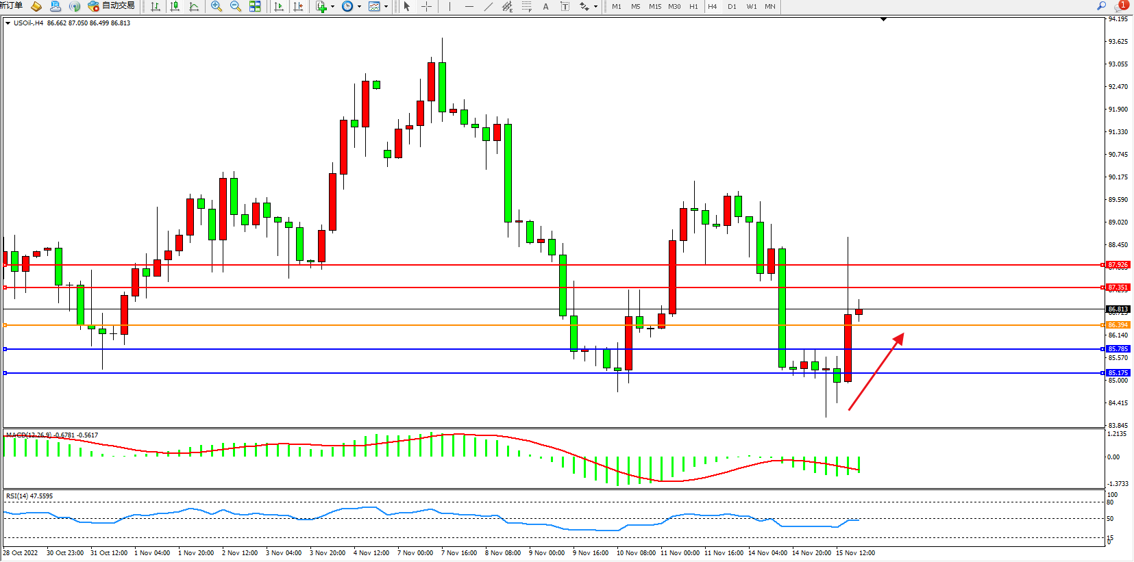原油USOil——4小时K线图显示: