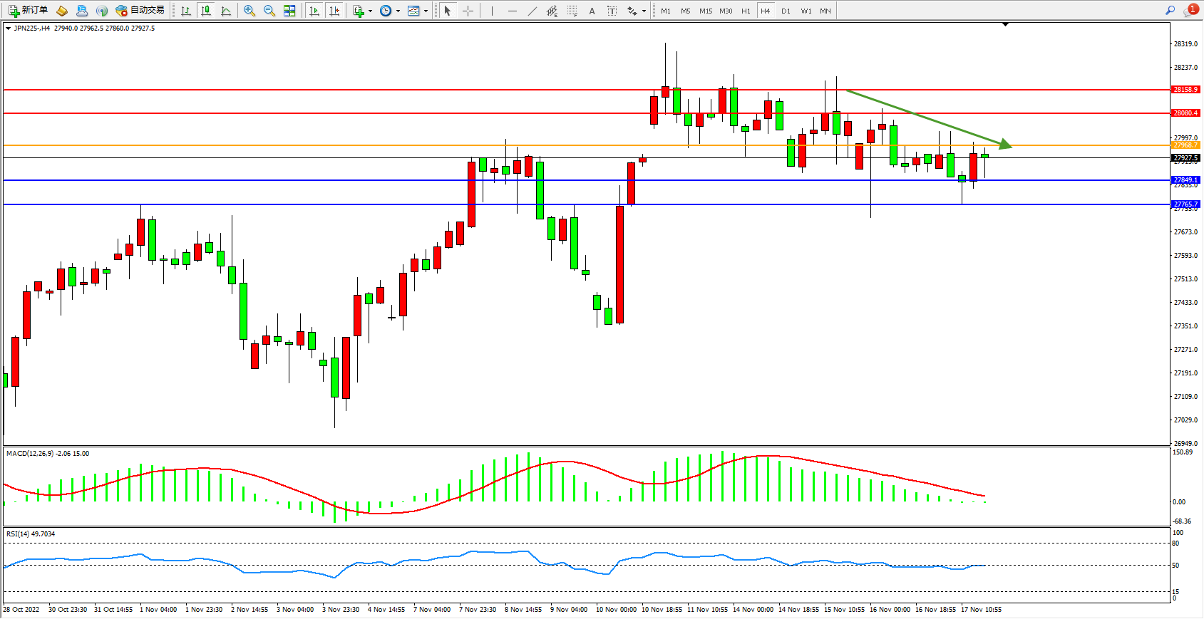 日经指数JPN225——4小时K线图显示: