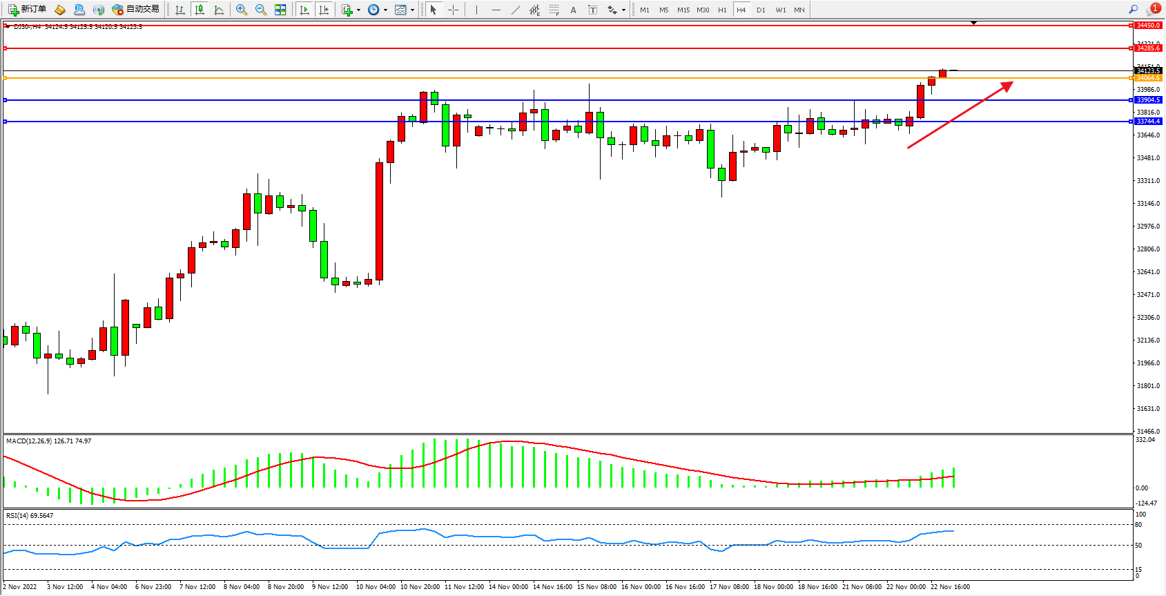 道琼斯指数DJ30——4小时K线图显示: