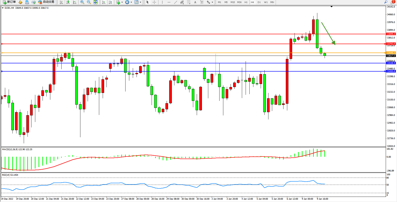 道琼斯指数DJ30——4小时K线图显示:
