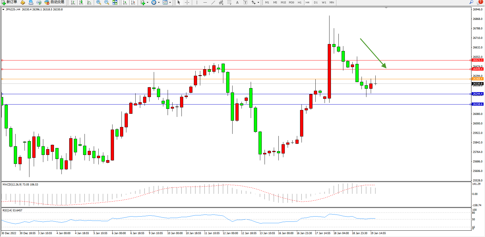 日经指数JPN225——4小时K线图显示: