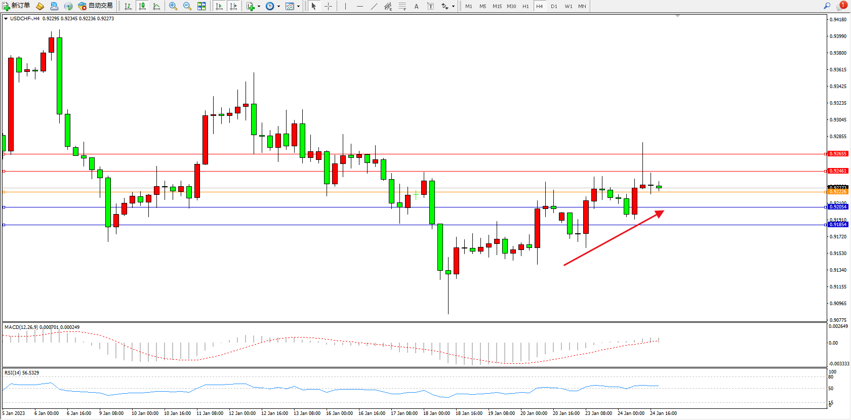 美元瑞郎USDCHF——4小时K线图显示: