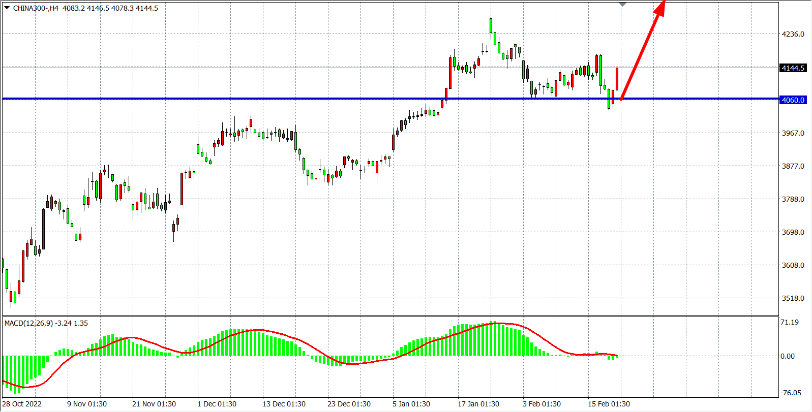 4小时图看,沪深300重返4060之上,出现“V型”反抽,多头趋势有望回归,同时MACD于零轴附近量能极度缩小,意味着新一轮方向突破在即,当前4060为短线强支撑,该位之上看4180-4250。
