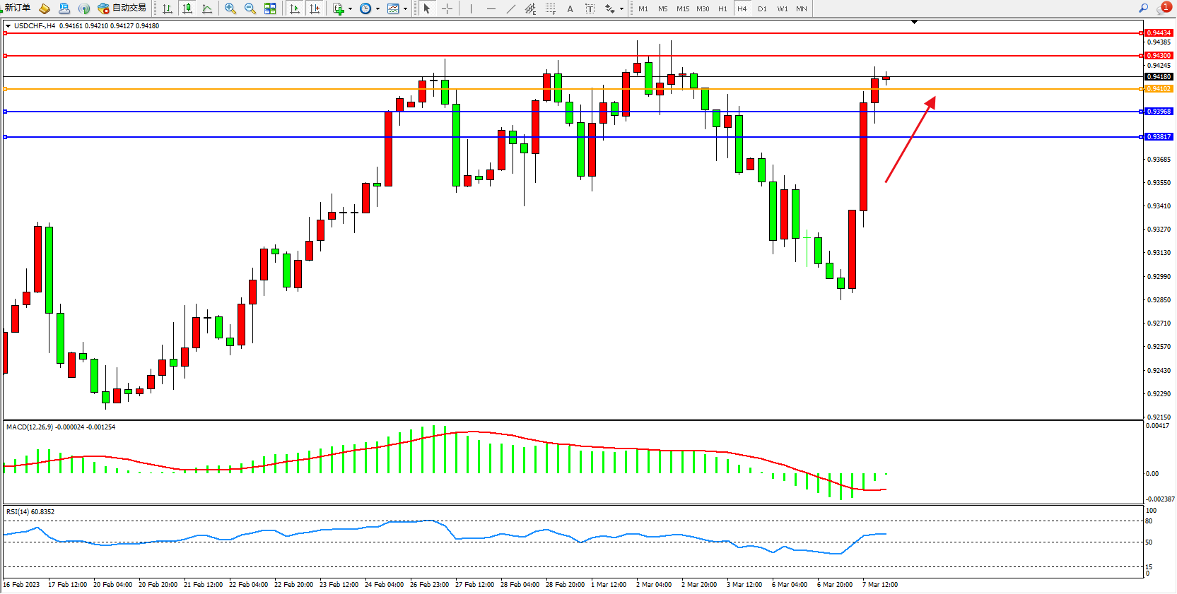 交易策略:0.94102上方看涨,目标0.94300 0.94434