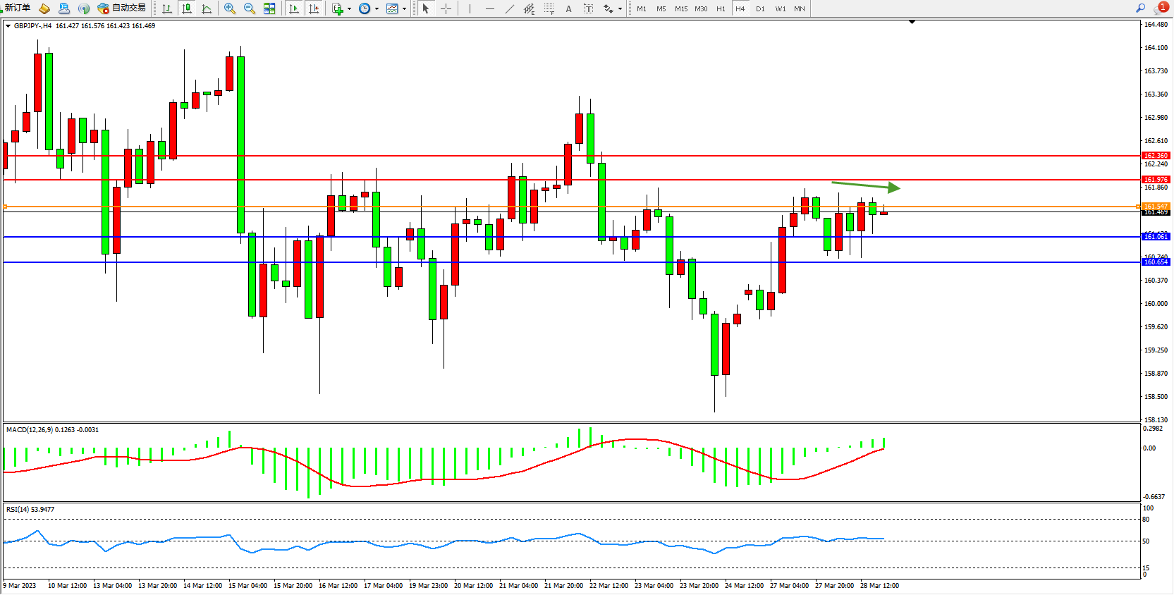 交易策略:161.469下方看跌,目标161.061 160.654
