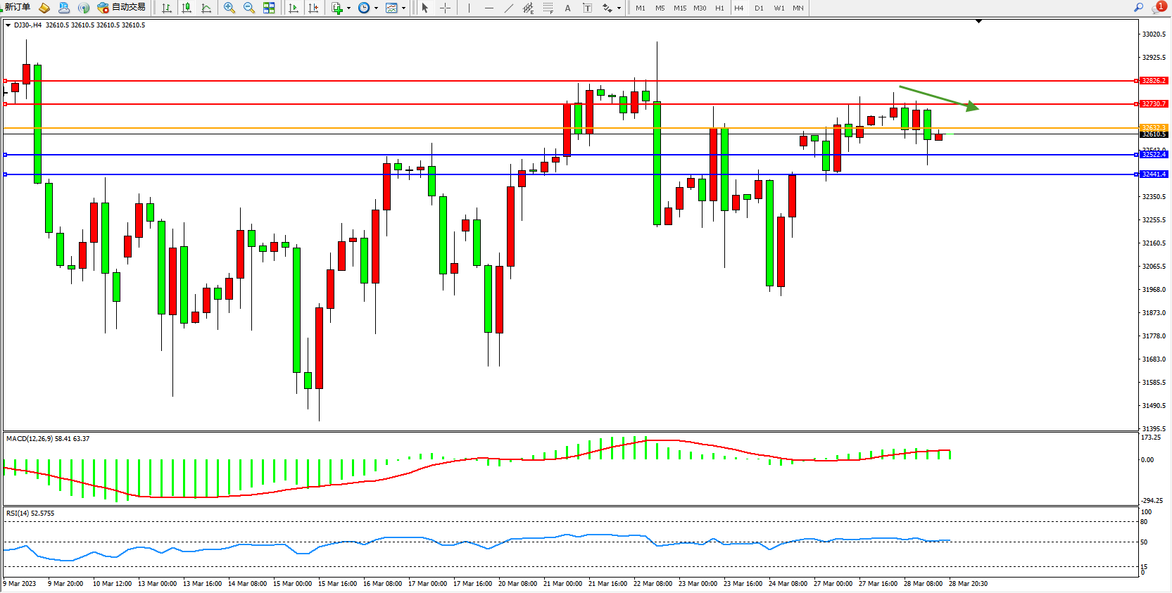 道琼斯指数DJ30——4小时K线图显示: