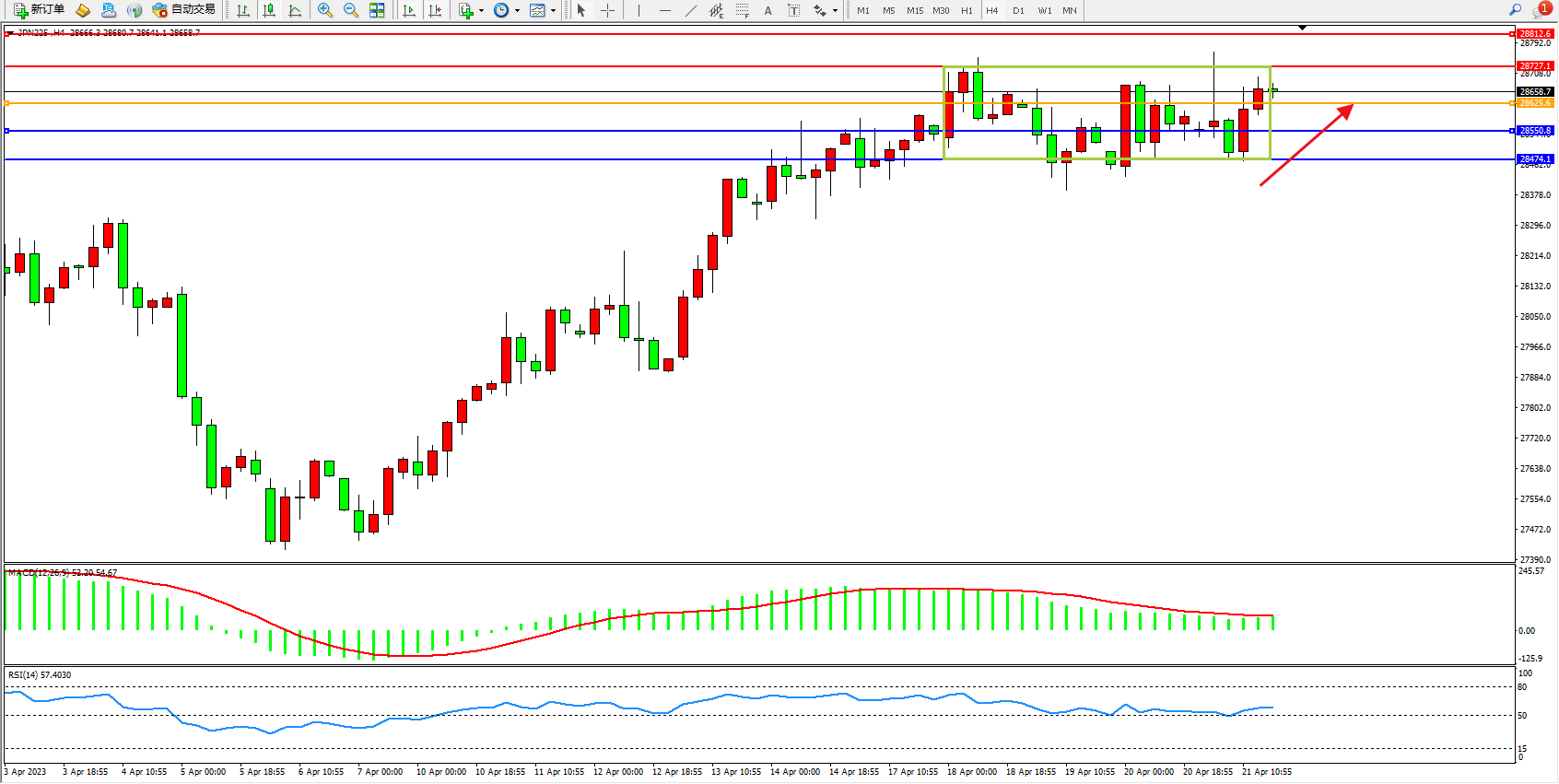 日经指数JPN225——4小时K线图显示: