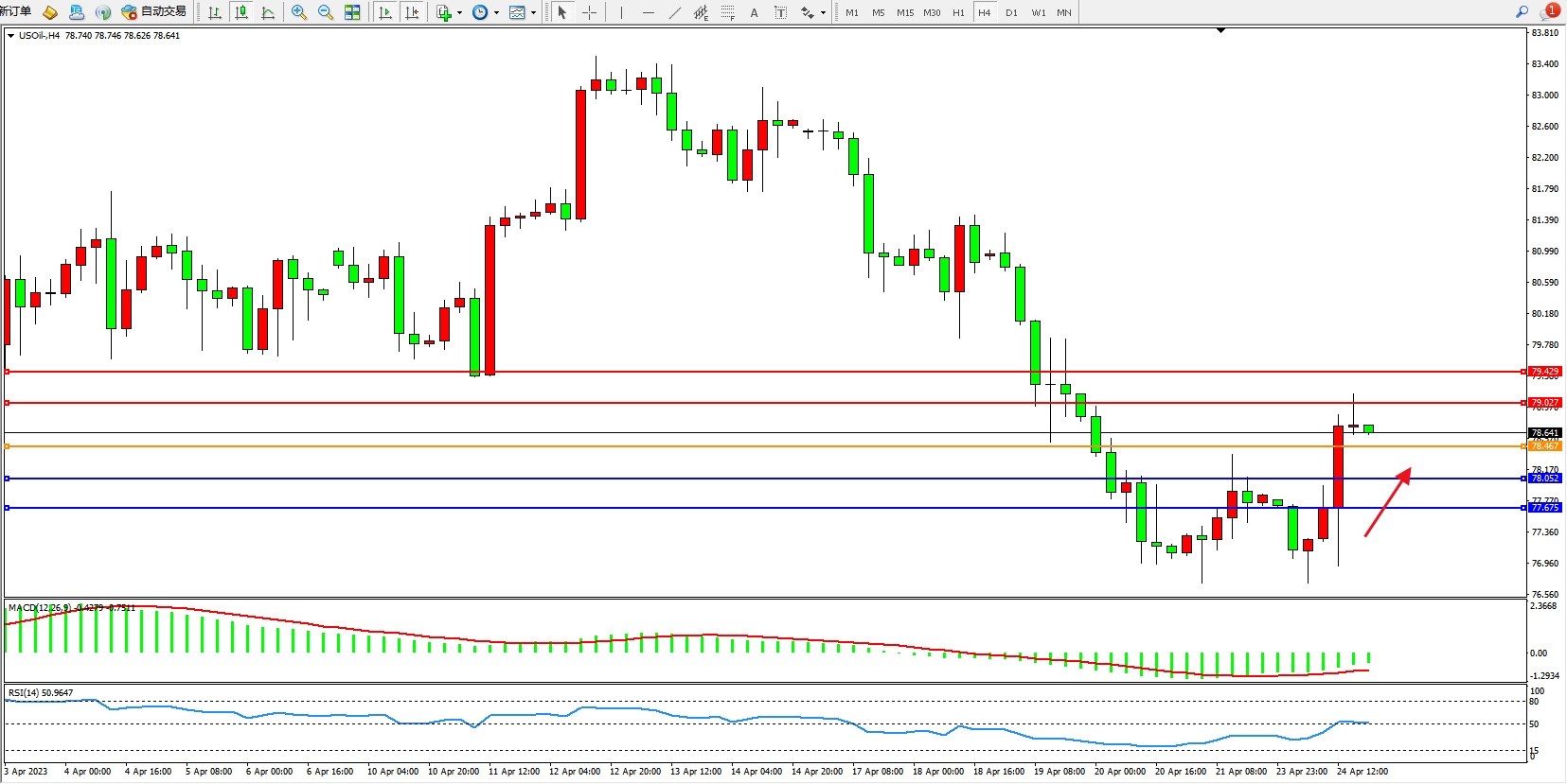 原油USOil——4小时K线图显示: