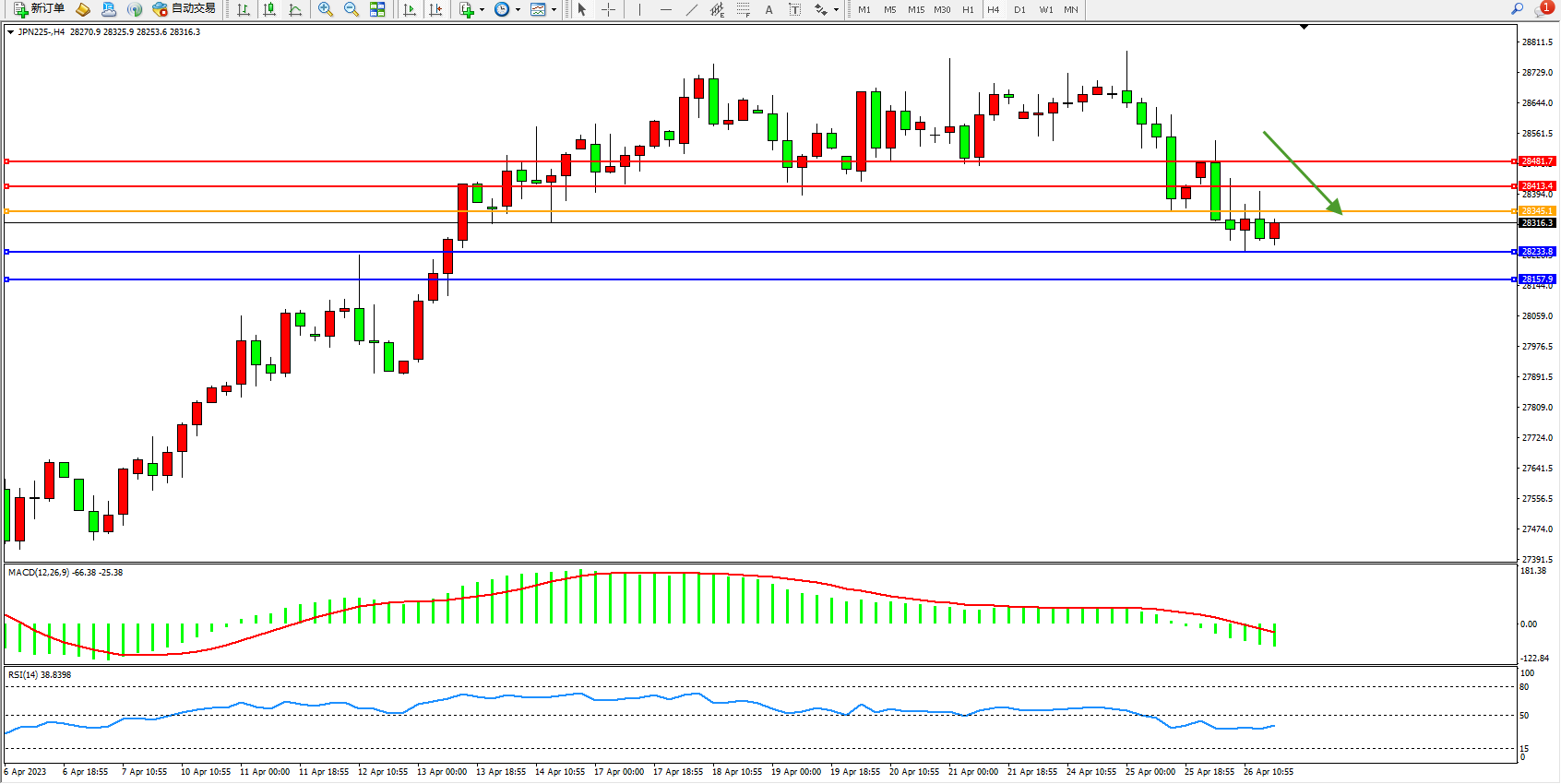 日经指数JPN225——4小时K线图显示: