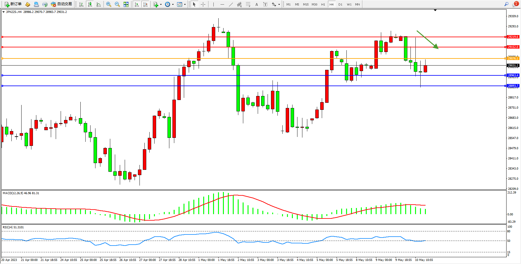 日经指数JPN225——4小时K线图显示: