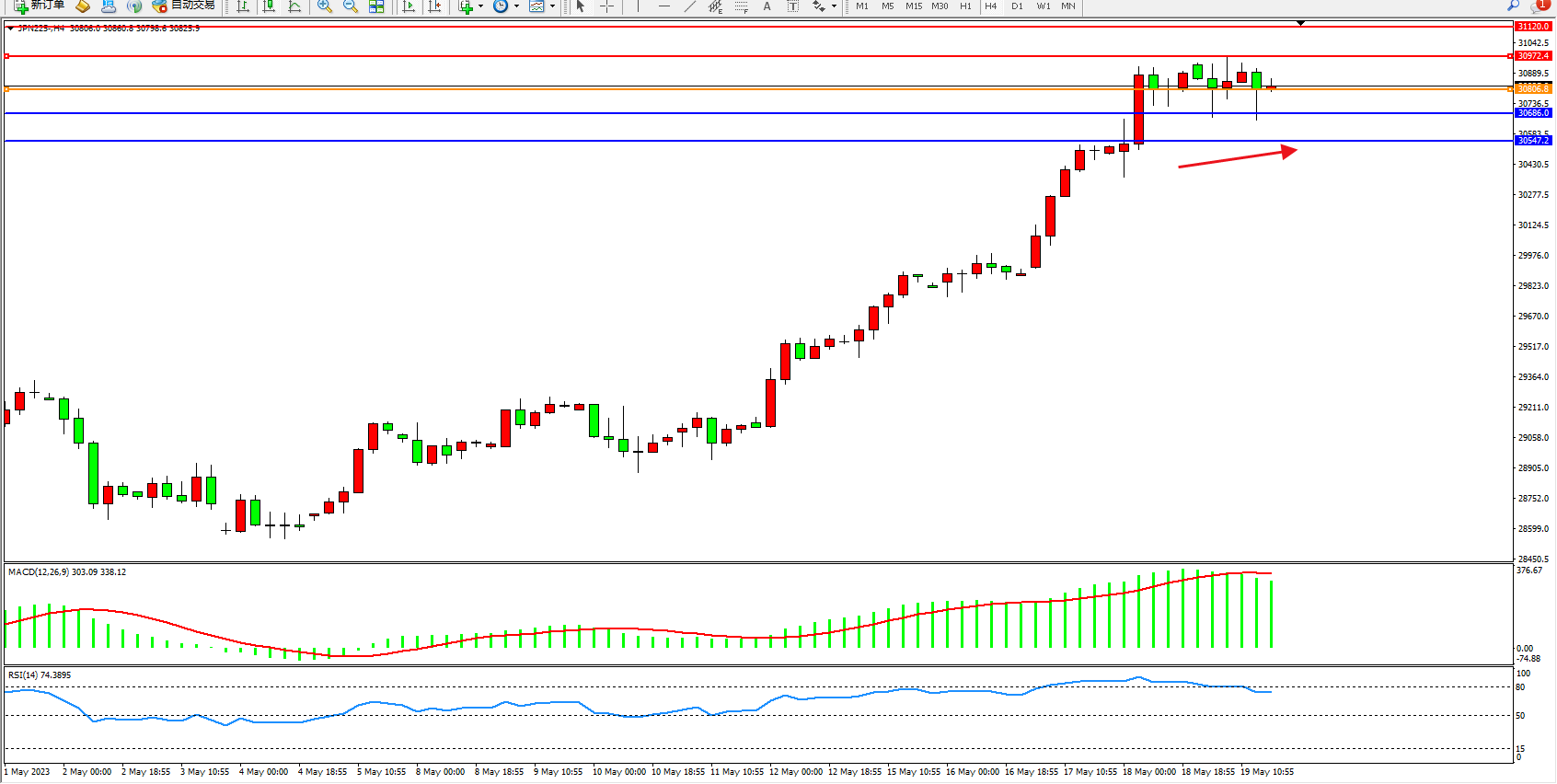 日经指数JPN225——4小时K线图显示: