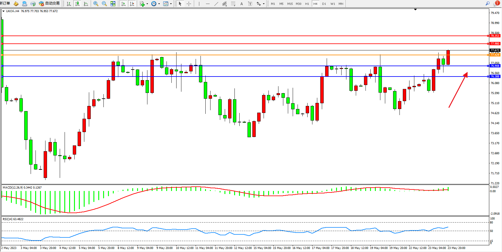 交易策略:77.429上方看涨,目标77.980  78.353