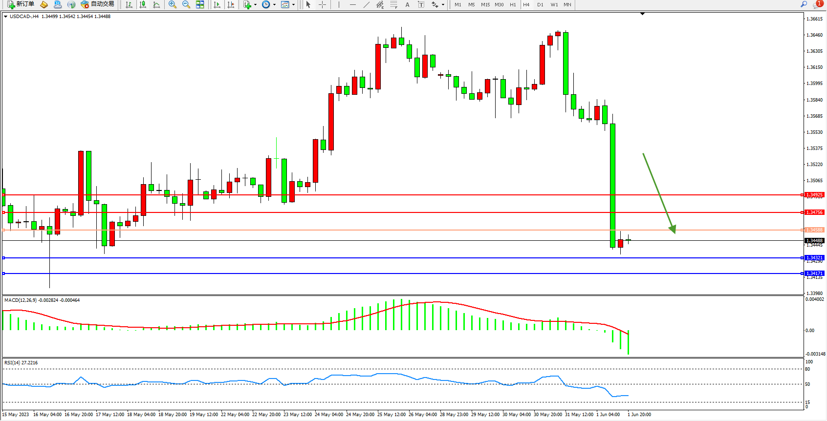 美元加元USDCAD——4小时K线图显示: