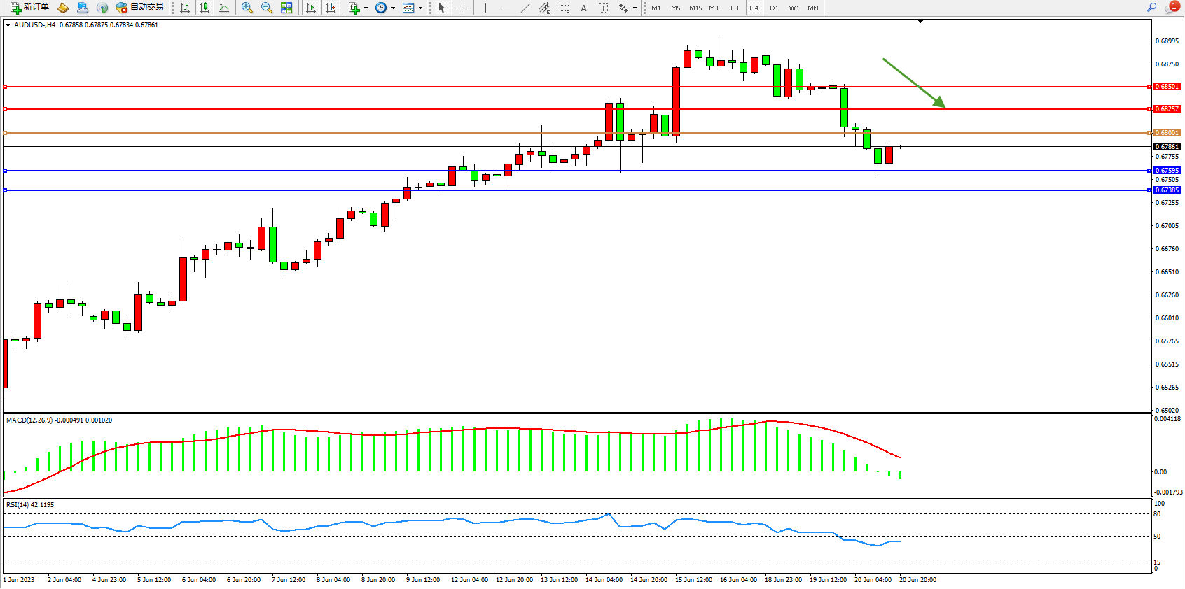 备选策略:0.60001上方看涨,目标0.68257 0.68501