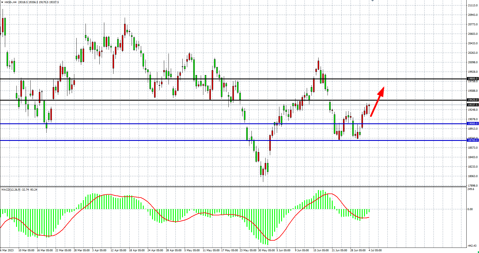 4小时图看,恒指在19000关口之上延续走强,MACD量能维持即将上穿零轴,趋势反弹动能逐步增强,在1900之上继续看涨。