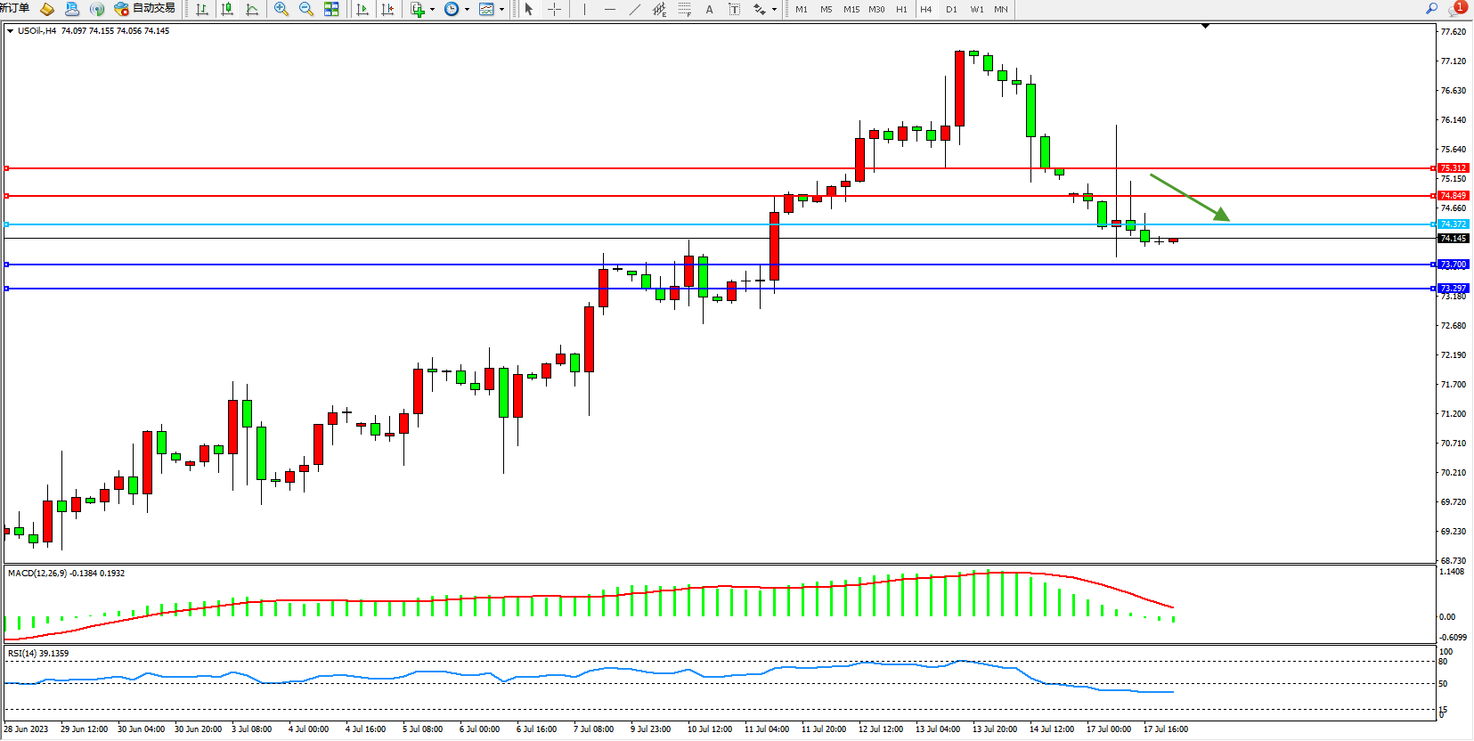 交易策略:74.145下方看跌,目标73.700  73.297