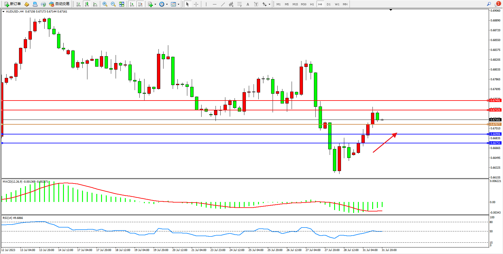 交易策略:0.67077上方看涨,目标0.67325 0.67491