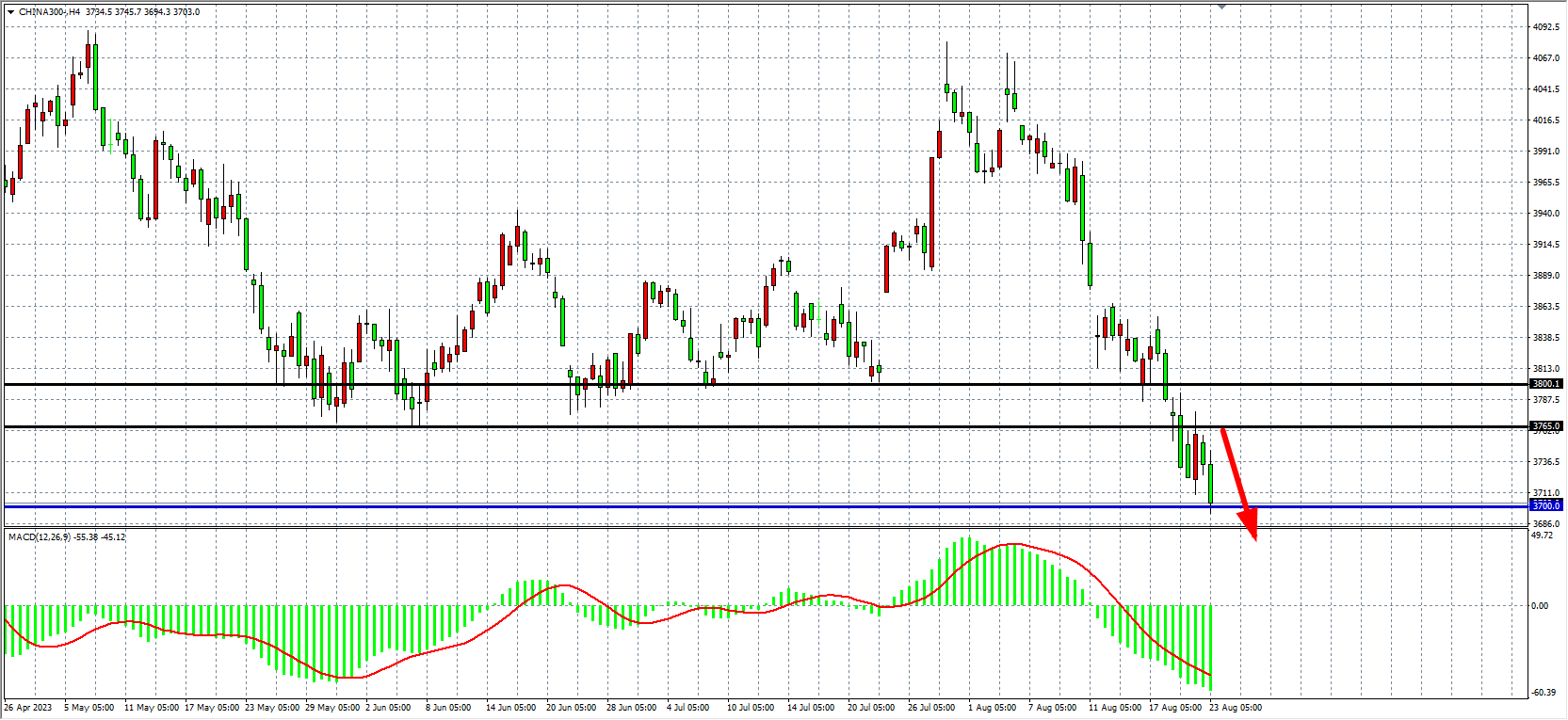 4小时图看,沪深300进一步跌至3700关口,MACD量能仍在零轴下放大,空头趋势延续,阻力关注3765-3800。
