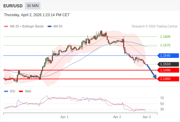 交易策略: 在 1.1540 之下,看跌,目标价位为 1.1490 ,然后为 1.1460 。