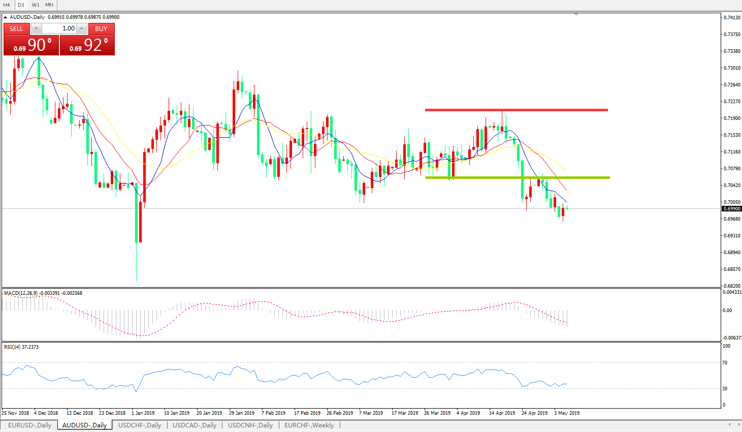 技术面简析:日图均线有序空头排列看跌汇价多空转折区域下方弱势反弹MACD下穿0轴且动能柱0轴下方放量,RSI低位弱势反弹预计汇价反弹整理后将进一步下行