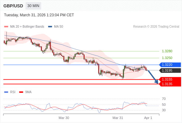 在 1.3220 之下,看跌,目标价位为 1.3155 ,然后为 1.3135 。