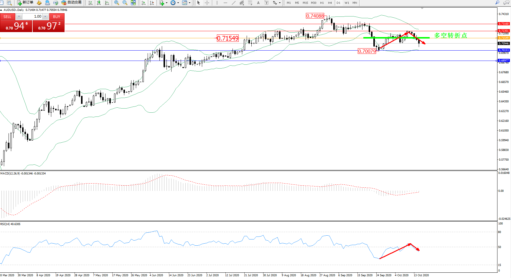澳元兑美元高位弱势持续下行至0.70886附近震荡,澳洲联储主席洛威表示,有可能将利率下调至0.1% ,市场揣测澳洲联储可能在下月进一步降息,虽然澳洲9月就业人数降幅不及预期,但就业人数仍确实因封锁措施而减少了2.95万,失业率也回升到6.9%,这无论如何都不是令人感到鼓舞的数据报告。 希望澳大利亚各州出台更多的财政刺激措施,尚未决定是否扩大政府债券购买计划,澳大利亚10年期国债的收益率高于其它大多数 ,正考虑购买较长期政府债券的好处 ,不能指望现有的政策措施迅速让通胀回到2.5%的水平,目前并不认为有扩大定期融资工具(TFF)的空间 。