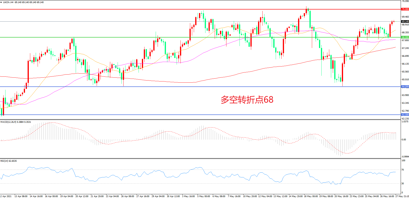 4小时图看,油价长阳拉升,突破前期整理区间,短期表现较为强势,21周期均线成为下方支撑,70美元成为中期阻力,MACD红柱增加,RSI指标走平,日内震荡上行概率较大。