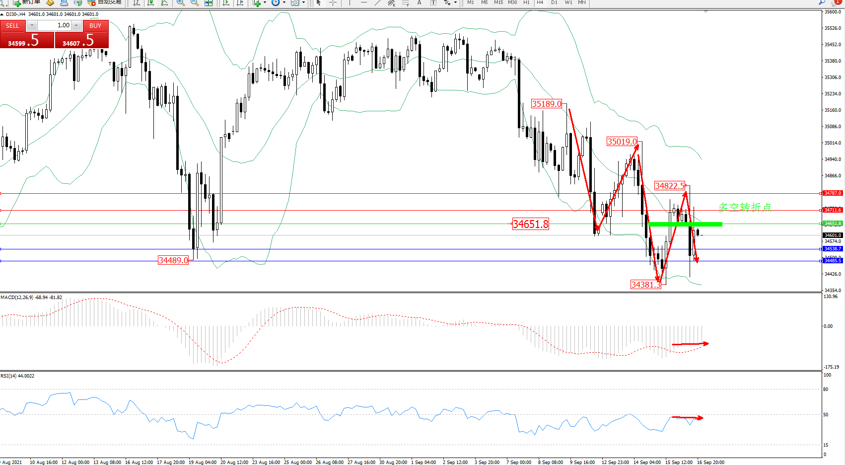 道琼斯指数DJ30——4小时K线图显示: