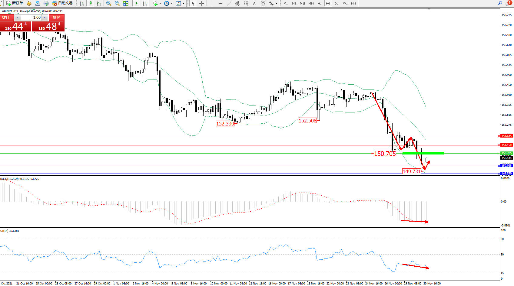 交易策略:150.705下方看跌,目标150.028、149.599
