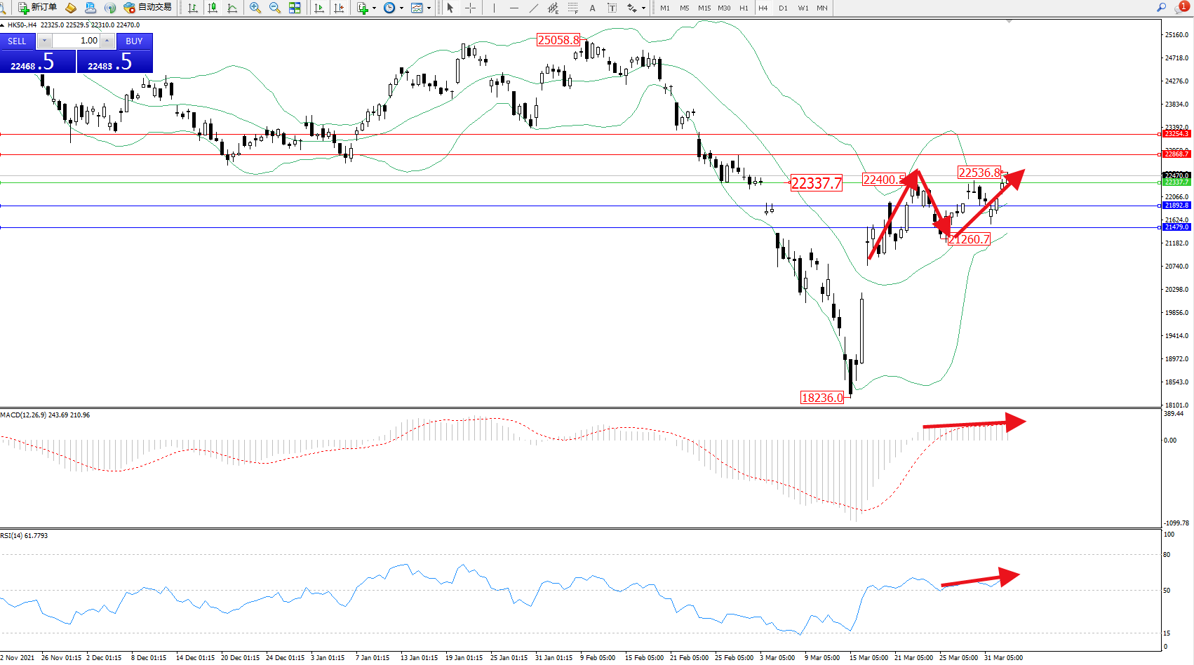 恒指HK50 ——4小时K线图显示: