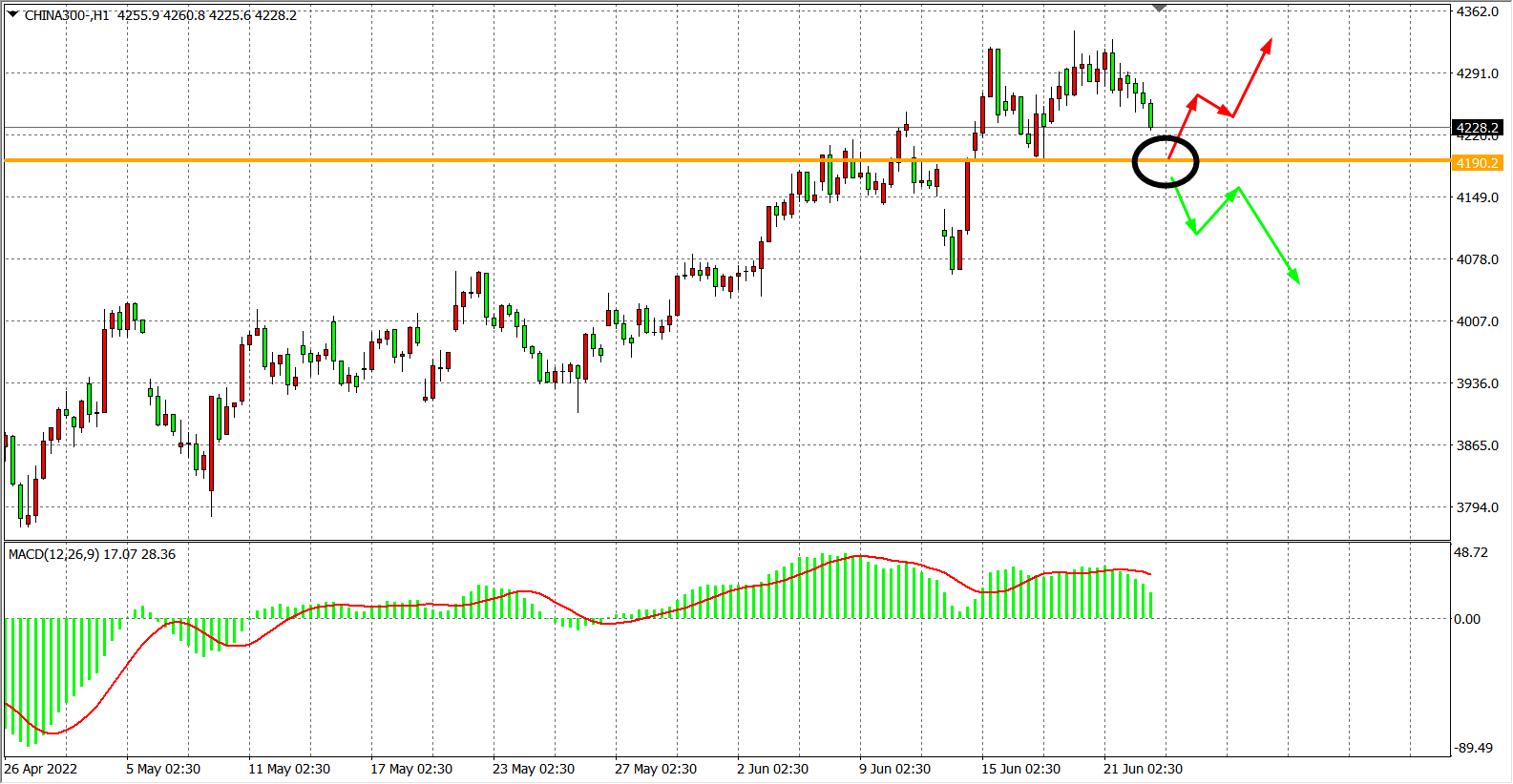 1小时图看,沪深300指数上破4190后,阻力已转化为支撑,当前维持在4190之上运行,MACD在零轴之上开始缩量,维持在4190之上继续看震荡反弹,目标4320-4450,下破4190则下看4060附近