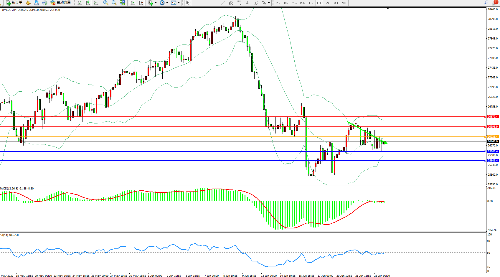 日经指数JPN225——4小时K线图显示: