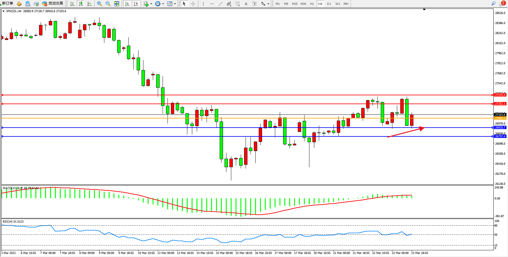 日经指数JPN225——4小时K线图显示: